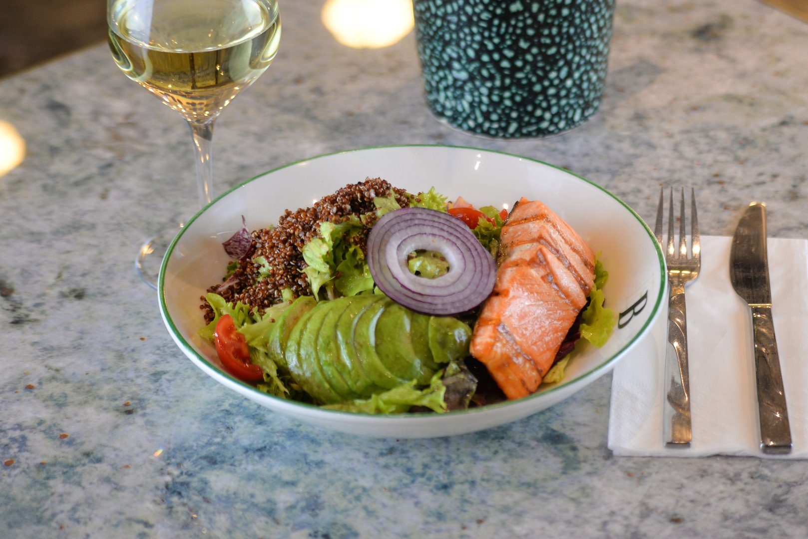 Izgara somon,roka,marul,akdeniz yeşilliği,kinoa,avakado,kırmızı soğan,kapari,fırın domates,yağ limon sos,