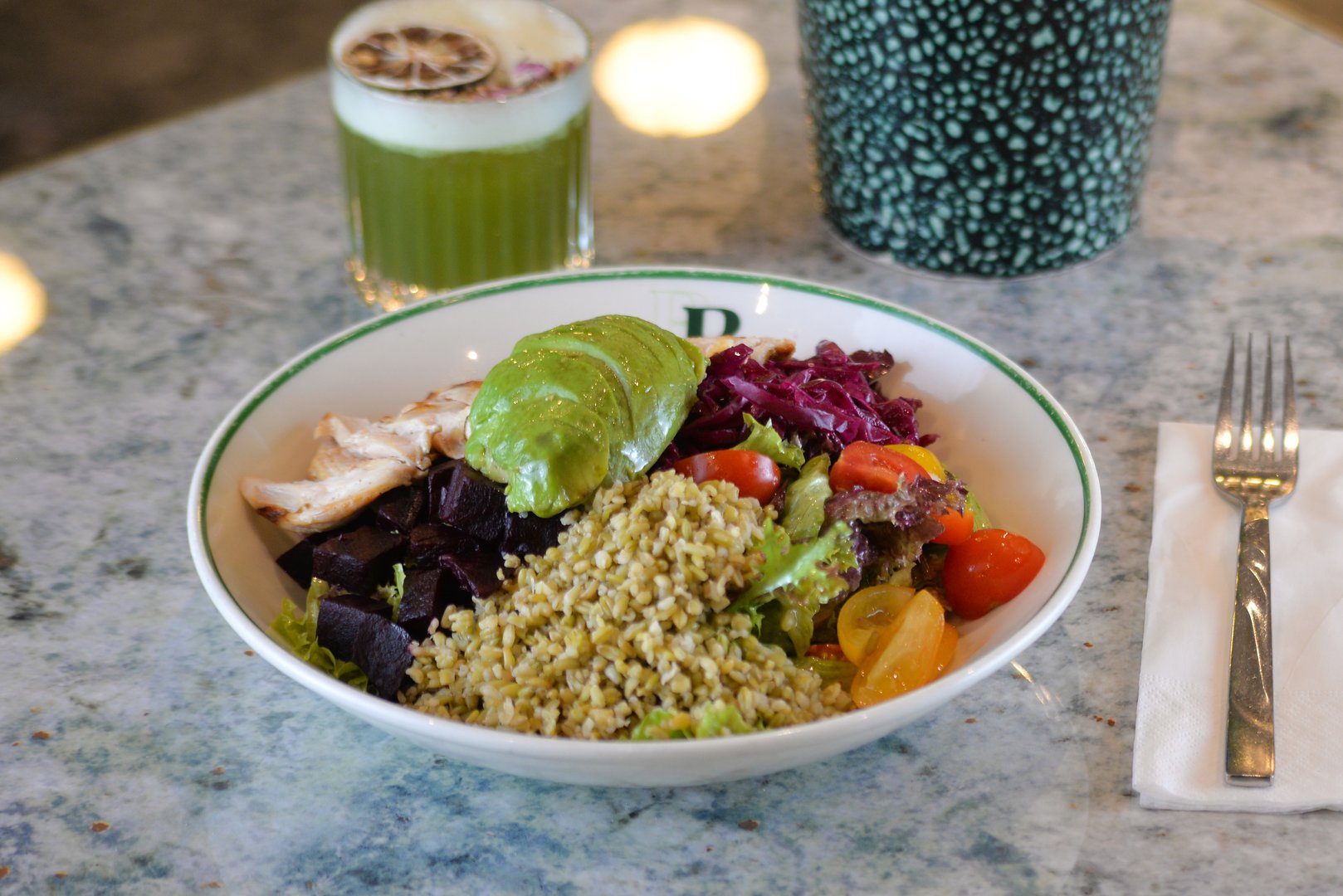 Izgara tavuk göğsü,yeşil salata,fırınlanmış domates,avakado,firik bulguru,yağ limon sos,kırmızı lahana ve pancar