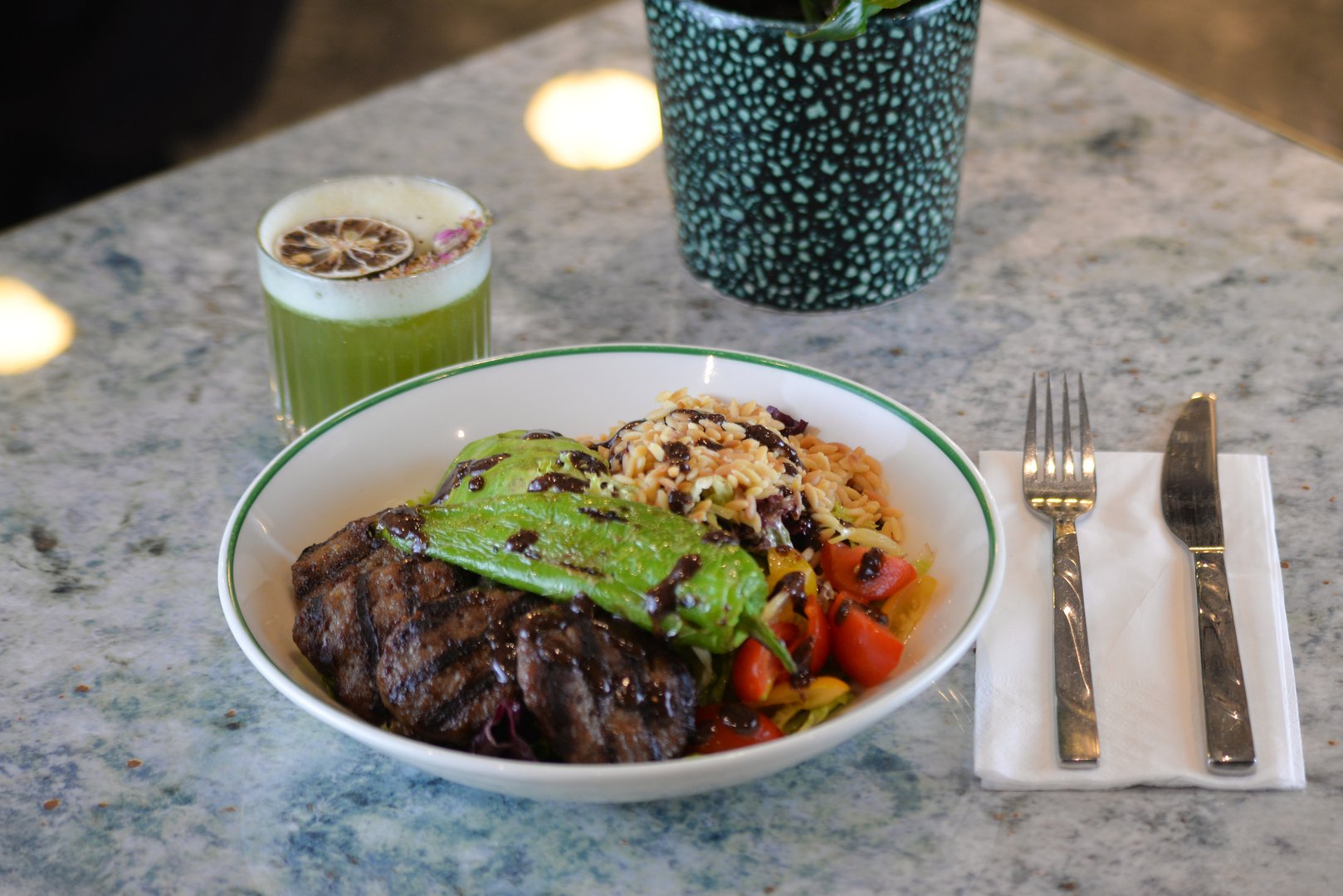 Izgara dana köfte,roka,marul,akdeniz yeşilliği,köy biberi,avakado,arpa şehriye,fırın domates,sumak sos