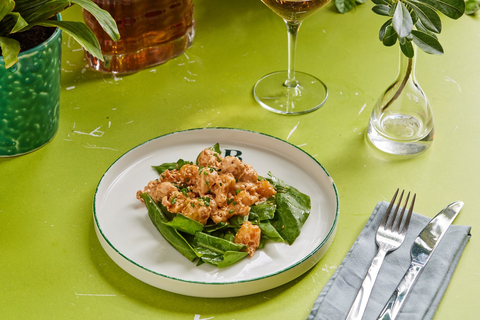Kuzu kulağı,acılı tempura sos,frenk soğan, kavrulmuş susam ile