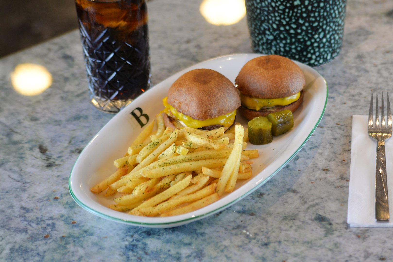 Dana burger,cheddar peyniri, salatalık turşusu,acılı ve mayonezli sos, patates kızartması ile