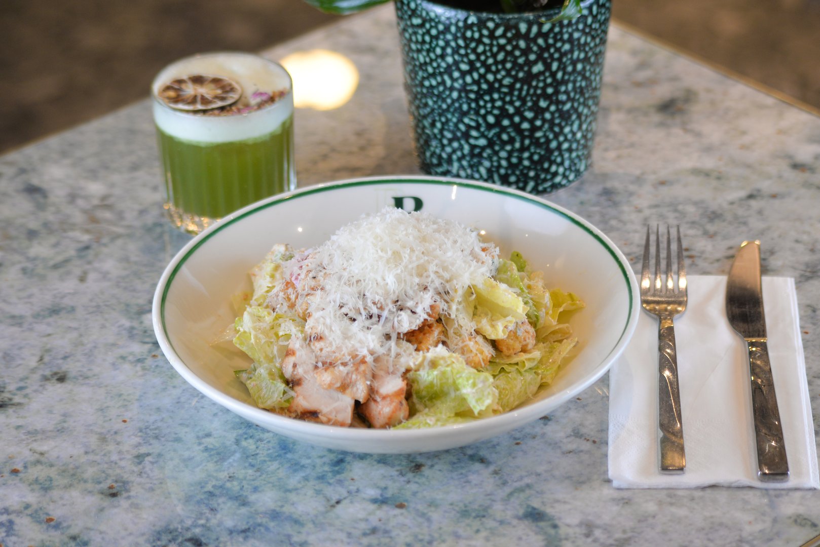 Sezar sos, ızgara tavuk, kroton ekmek, göbek yeşil marul, parmesan, kuru domates