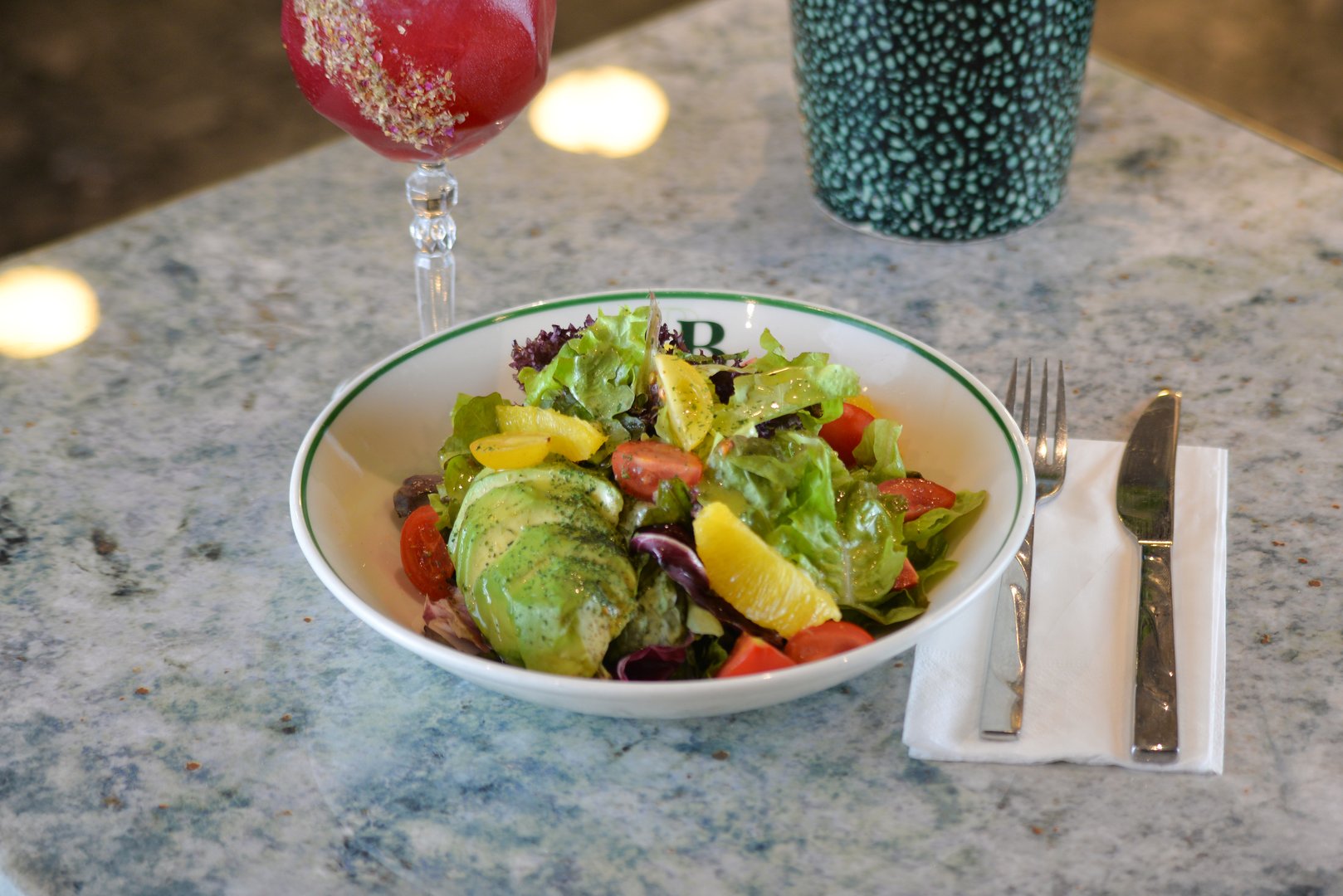Gül marul, roka, akdeniz yeşillik, avakado, fırınlanmış domates,limon sos,mandalina ve zeytin yağı ile